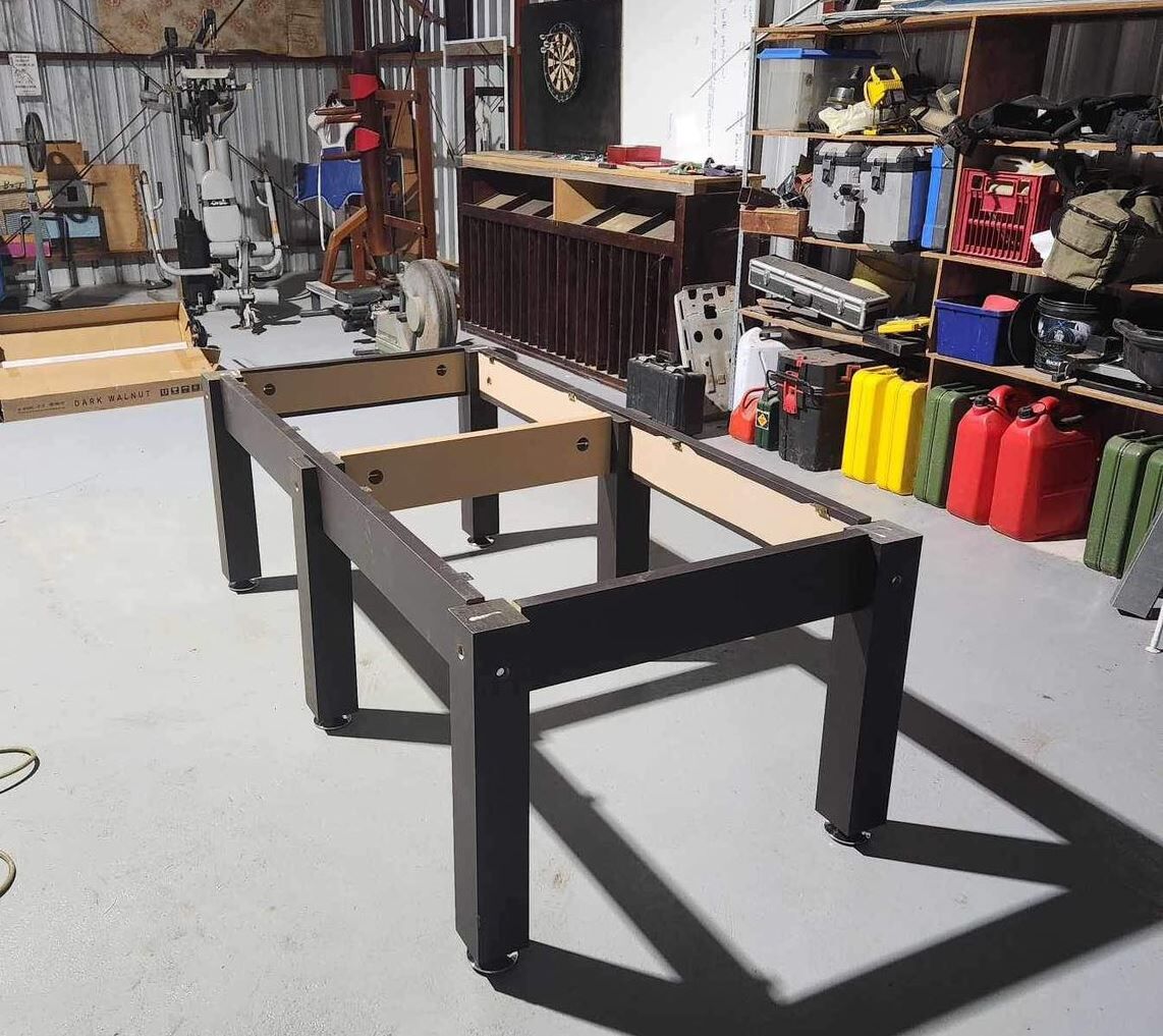 Please note, we have the same style pool table available with either an MDF timber top or a slate top. The four additional dowel holes on the table frame are intended for the MDF top version. The three slate pieces simply rest on the frame and do not need to be bolted onto the frame.